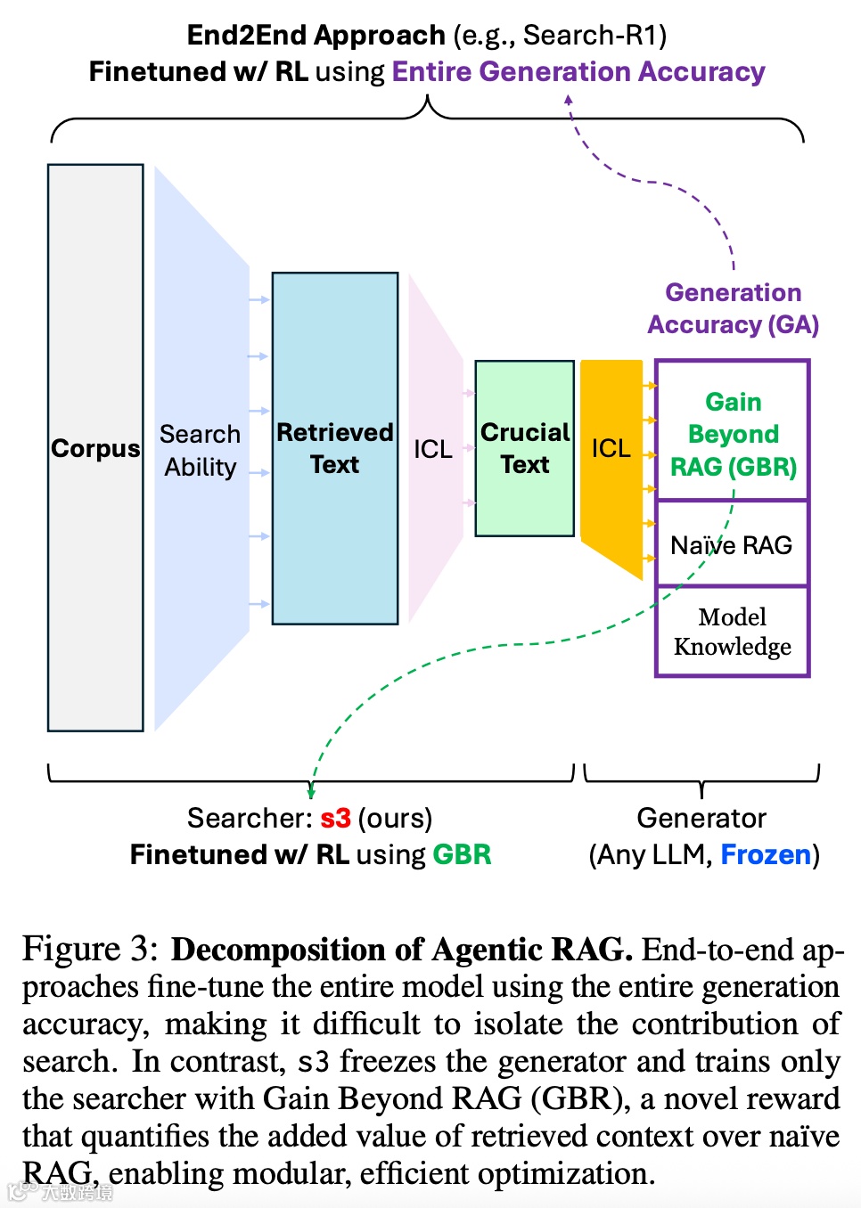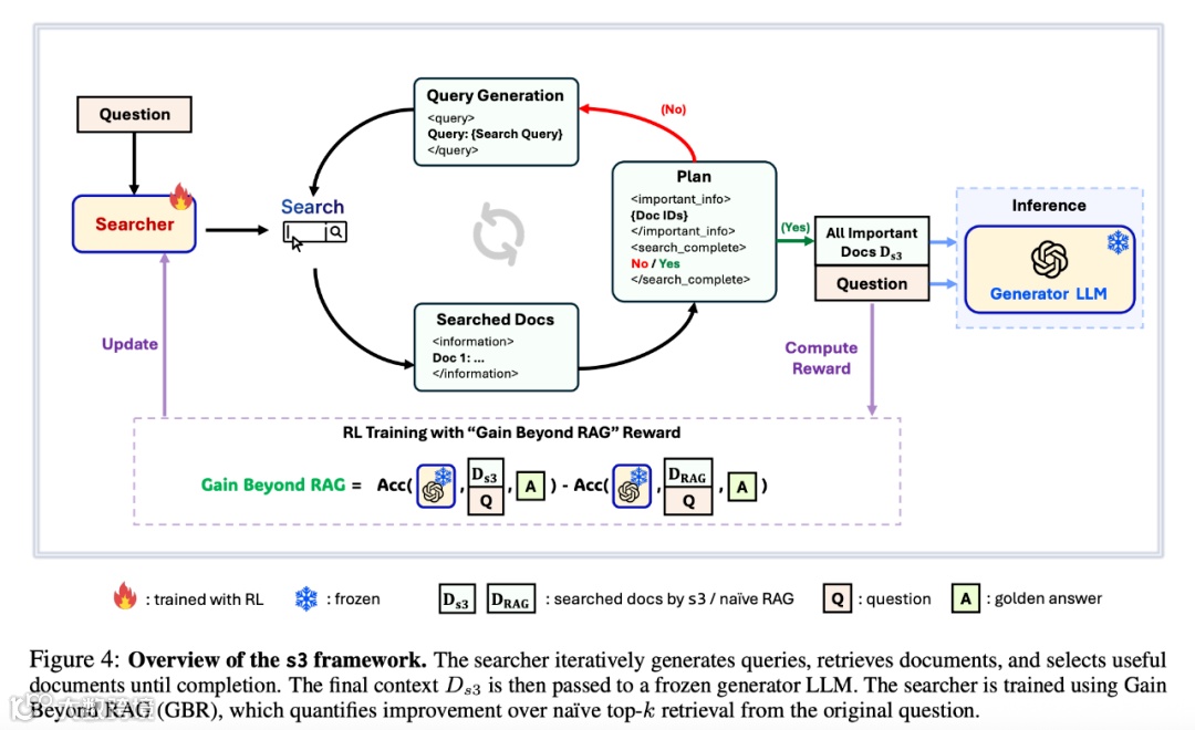 s3 的出发点十分简单:如果真正关心的是 “搜索提升了生成效果”,那就应该只训练搜索器、冻结生成器,并以生成结果提升为奖励。这便是 “Gain Beyond RAG(GBR)” 的核心定义。具体而言,GBR 衡量的是用 s3 搜索到的上下文喂给 Frozen Generator(冻结的生成器)之后的生成效果,相比初始的 top-k 检索结果是否更好。值得注意的是,s3 训练时始终初始化于相同的原始 query,从而能清晰对比 s3 检索对结果带来的真实 “增益”。