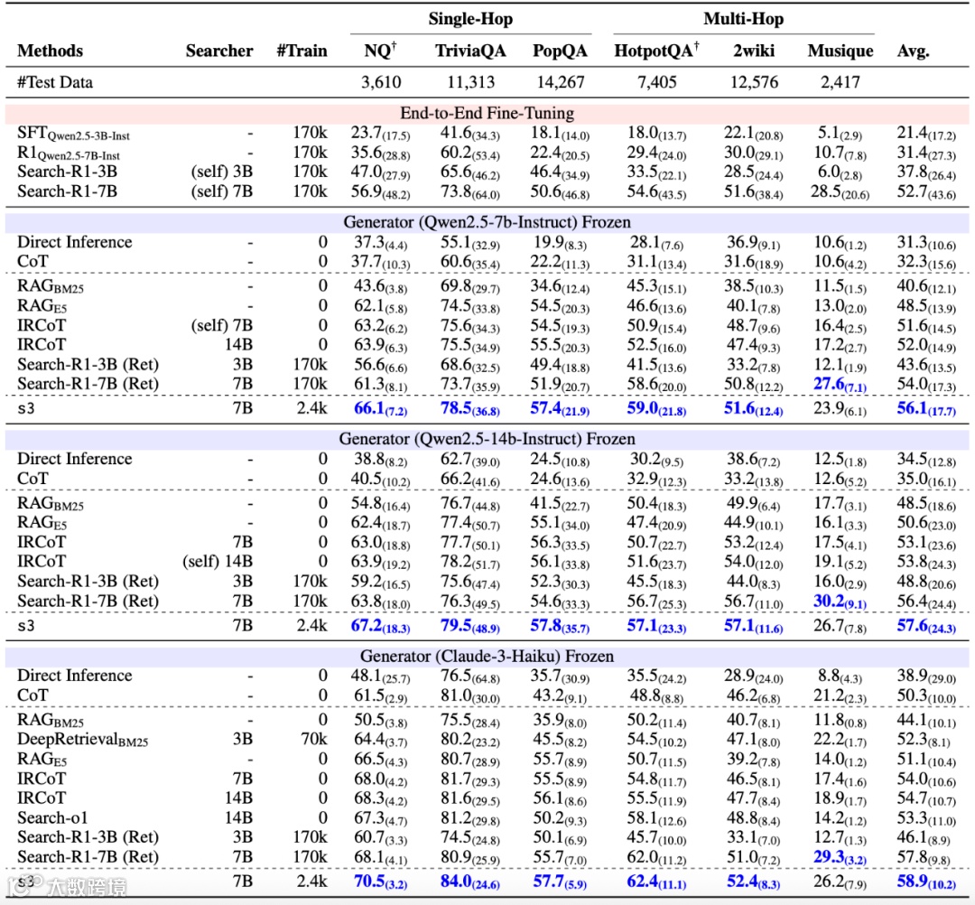 而关于 s3 为什么不训练生成器,是否限制了模型性能的疑问,其设计的核心理念是:如果想真正优化搜索效果,不应让生成器被训练,否则会混淆 “搜索变好” 与 “语言模型变强” 带来的增益。冻结生成器不仅提升了训练效率,节省了大模型微调成本,也便于模型迁移到不同任务与生成器,真正做到 “搜索能力即插即用”。通过专注于搜索器的优化,s3 能够更精准地提升搜索策略的有效性,为生成器提供更优质的检索信息,在不依赖生成器训练的情况下,依然能够实现出色的生成效果,同时提升了模型的通用性与灵活性。