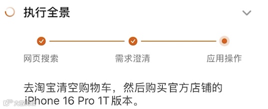 先看云手机任务中的淘宝购物测试,测试的 prompt 是 “帮我清空淘宝购物车再购买官方店铺的 iphone16 pro 1t 版本”。在这个测试中,AutoGLM 展现出了较为完整的流程:从网页搜索、需求澄清到应用操作都能按部就班地进行。但问题出在了账号登录环节 —— 如今国内的应用几乎都要求登录才能使用。AutoGLM 会在检测到登录需求时提示用户 “接管”,由人手动输入账号密码,之后退出接管继续任务。