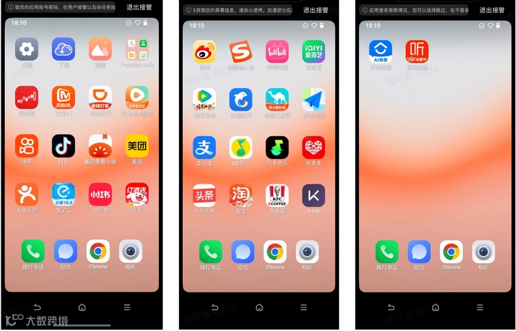 先看 AutoGLM 云手机,除去系统自带的相机、时钟等 APP,额外预装了 30 款 APP,基本能覆盖生活和娱乐的主要场景。社交资讯类有微博、小红书、今日头条;长短视频类包含红果、抖音、快手、B 站、爱奇艺、腾讯视频、芒果 TV;音乐广播类有 QQ 音乐、汽水音乐、喜马拉雅;小说阅读类有番茄小说;消费购物类有同花顺、淘宝、京东、拼多多;本地生活类有美团、饿了么、大众点评、支付宝、KFC、Keep;出行与旅行类有滴滴打车、携程、去哪儿、高德;租房类则有贝壳找房。