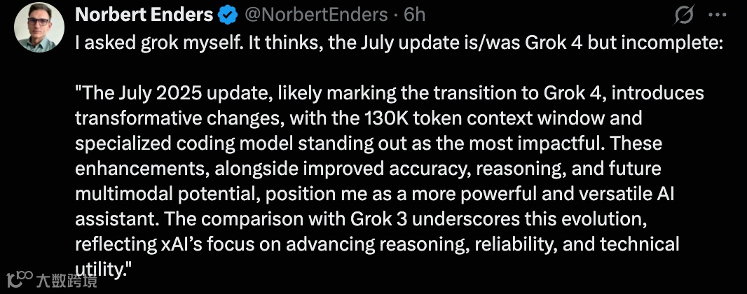 展望未来,Grok 4 的正式发布将接受更严苛的现实检验。其在 HLE 上的突破性得分能否在开放域对话中复现,编程能力能否适应复杂工程场景,动态推理引擎在长期使用中的稳定性如何,这些问题都需要通过大规模用户测试来解答。但无论如何,此次泄露事件已然证明:AI 技术正在跨越 "感知智能" 的边界,向 "认知智能" 的深水区迈进,而 Grok 4 可能正是推动这一进程的关键坐标。