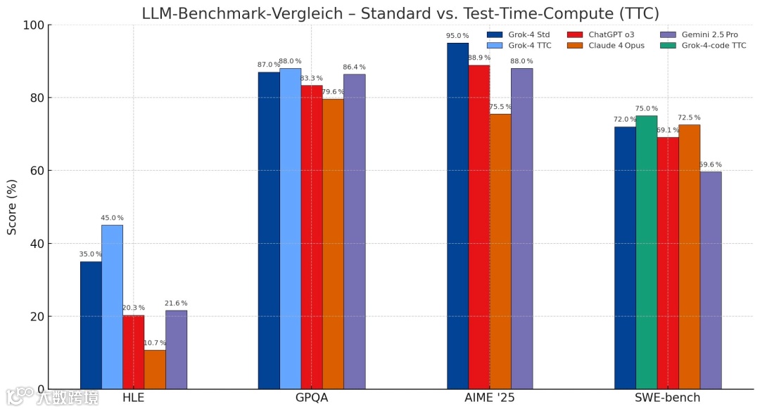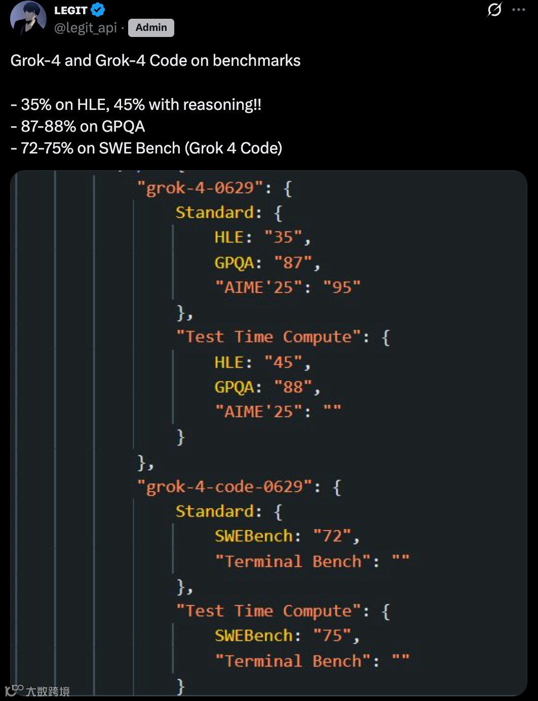 作为 AI 领域最受关注的事件之一,Grok 4 和 Grok 4 Code 的基准测试成绩泄露引发了广泛讨论。X 博主 @legit_api 披露的数据显示,Grok 4 在 HLE(Humanities Last Exam)标准得分 35%,启用推理技术后提升至 45%;GPQA(研究生级物理与天文学问题)得分 87-88%;Grok 4 Code 在 SWE Bench(编程能力测试)中达到 72-75%。这些数据不仅刷新了多项基准记录,更在 AI 行业掀起了关于技术突破与竞争格局的深度探讨。