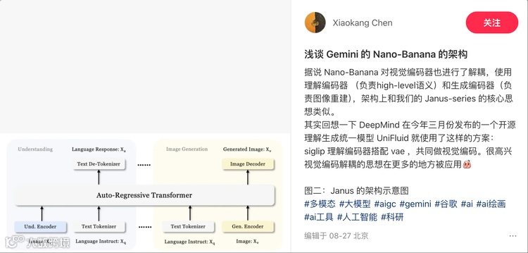 另一种更具说服力的技术猜想指向 "双编码器架构"。借鉴 Janus 和 UniFluid 的设计思路,Nano Banana 可能在同一 Transformer 主干上同时接入语义编码器和像素编码器:前者基于 SigLIP 模型处理视觉理解任务,后者通过 SDXL-VAE 实现图像生成,这种架构使模型能高效实现 "看图理解" 与 "文本出图" 的双向能力。这种设计突破了传统多模态模型 "理解与生成割裂" 的瓶颈,形成 "视觉输入 - 语义解析 - 创意生成 - 视觉输出" 的完整闭环。团队成员强调的 "图像理解和图像生成像姐妹能力",正是这种架构优势的直观体现 —— 当模型能更好理解图像内容时,生成精度自然随之提升。