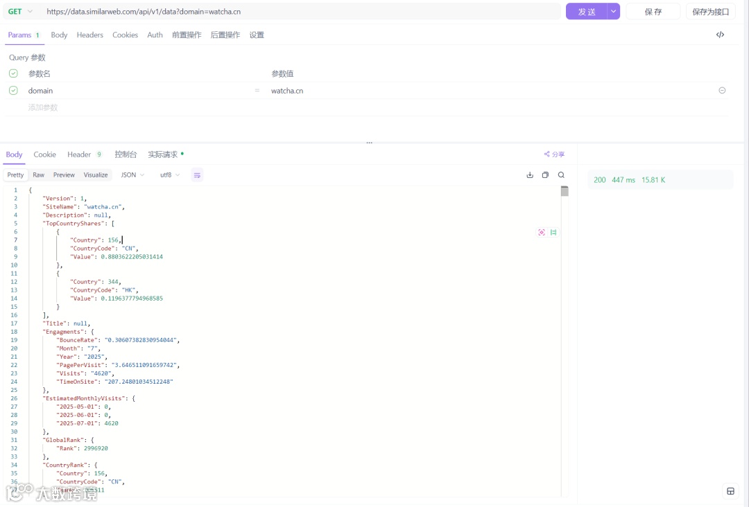 SimilarWeb API 能够提供丰富的网站流量和用户行为数据,其调用示例https://data.similarweb.com/api/v1/data?domain=example.com中,domain参数指定了要查询的网站域名。通过调用该 API,可以获取到如traffic.visits(月访问量)、engagement.bounce_rate(跳出率)等核心指标,这些指标对于评估网站的流量状况和用户 engagement 程度具有重要价值。例如,通过分析traffic.visits的变化趋势,可以了解网站的流量增长情况;通过分析engagement.bounce_rate,可以评估网站内容对用户的吸引力。在使用 SimilarWeb API 时,需要注意 API 的调用限制和数据准确性,不同的 API 套餐可能有不同的调用次数限制,需要根据实际需求选择合适的套餐。同时,由于数据采集和统计方法的不同,SimilarWeb API 提供的数据可能与网站实际的流量数据存在一定的偏差,在使用过程中需要结合其他数据来源进行综合分析,以提高数据的准确性和可靠性。