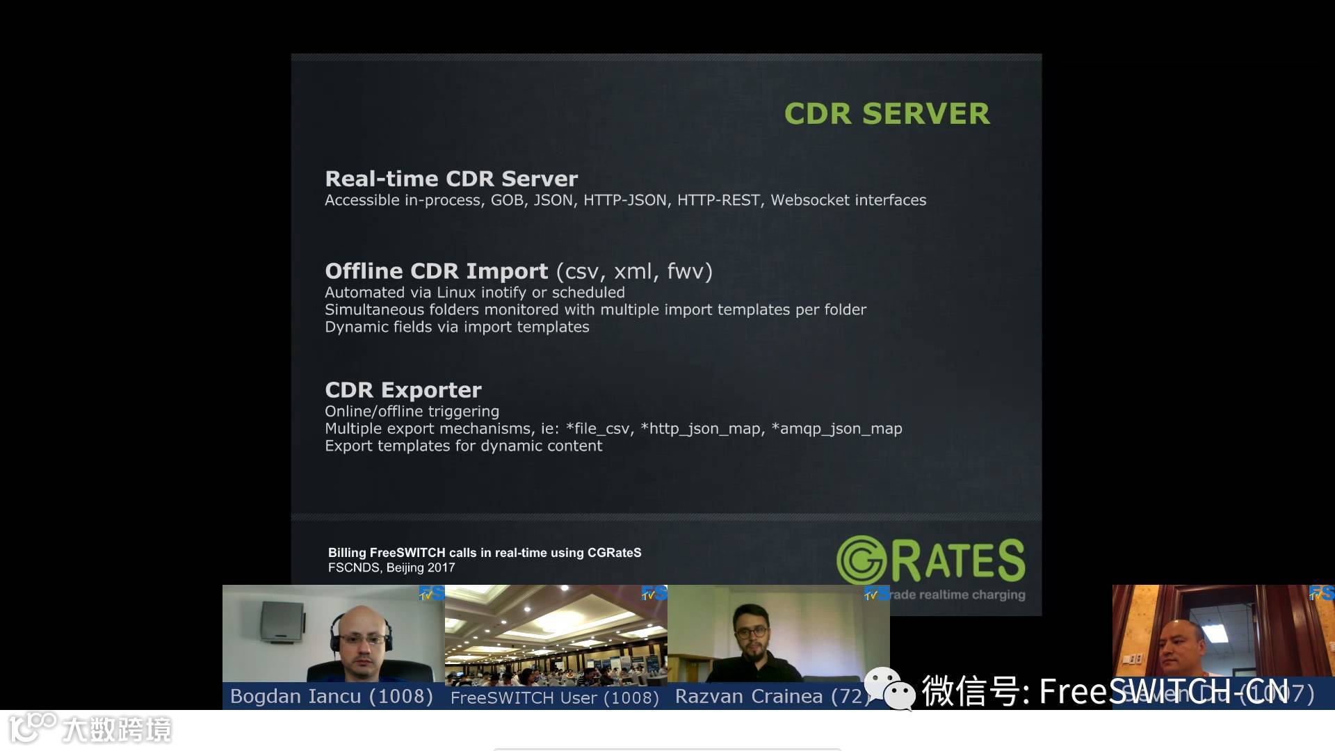 下午下半场是来自欧洲的老师们。由于时差的关系,来自美国的FreeSWITCH团队早上讲,来自欧洲的就下午讲。Dan Christian Bogos是CGRates的创始人,他基于Go语言写的CGRates是FreeSWITCH生态里重要的一环,FreeSWITCH帮助大家打通电话,CGRates用于计费,挣钱。