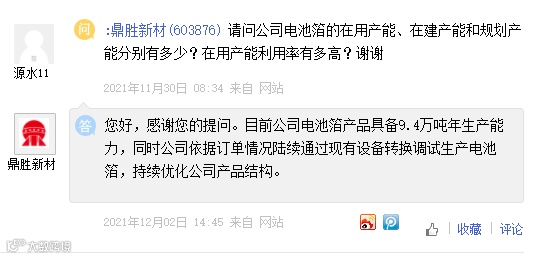 12月2日,鼎盛新材在互动平台表示,目前公司电池箔产品具备9.4万吨/年的生产能力,同时依据订单情况陆续通过现有设备转换调试生产电池箔,持续优化产品结构。