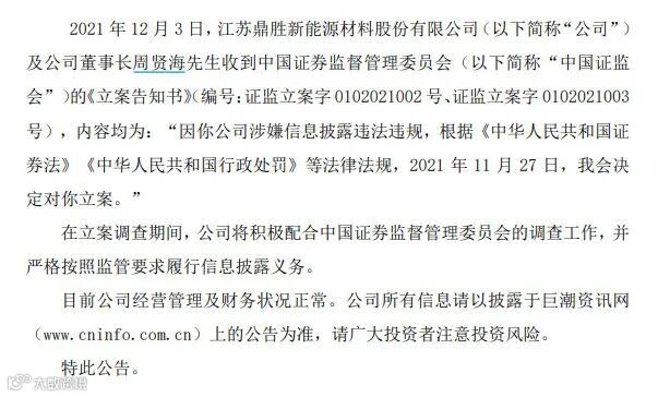 4个月涨近3倍的锂电材料龙头突遭利空!12月3日晚,鼎盛新材公告,因涉嫌信息披露违法违规,公司及董事长周贤海收到证监会《立案告知书》。