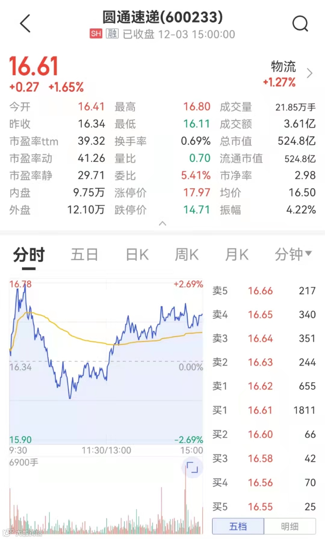 中证金牛座APP数据显示,12月3日,圆通速递股价收报16.61元/股,涨1.65%,市值为524.8亿元。