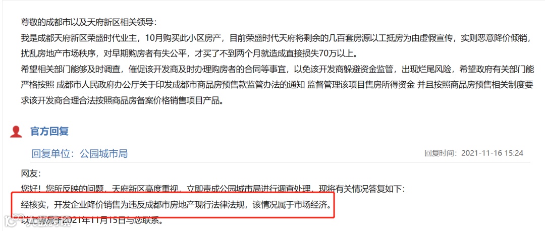 对于业主的反映的问题,四川天府新区成都管委会公园城市局回应称:“经核实,开发企业降价销售未违反成都市房地产现行法律法规,该情况属于市场经济。”