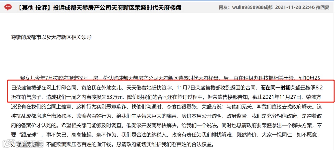 一位网友在问政四川的官网上反映:“我女儿今年7月按政府规定摇号一房一价认购荣盛时代天府楼盘,之后一直积极办理按揭相关手续。10月25日,售楼部在网上打印合同,寄给我女儿,天天催着她赶快签字。11月7日售楼部收到返回的合同,而在同一时期荣盛已按照8.2折在销售房子,造成我们一周之内直接损失53万元,降价时我们的合同还在签订过程中。”