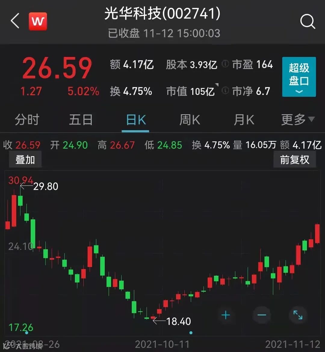 11月12日,光华科技大涨5.02%,收报26.59元,市值105亿元。