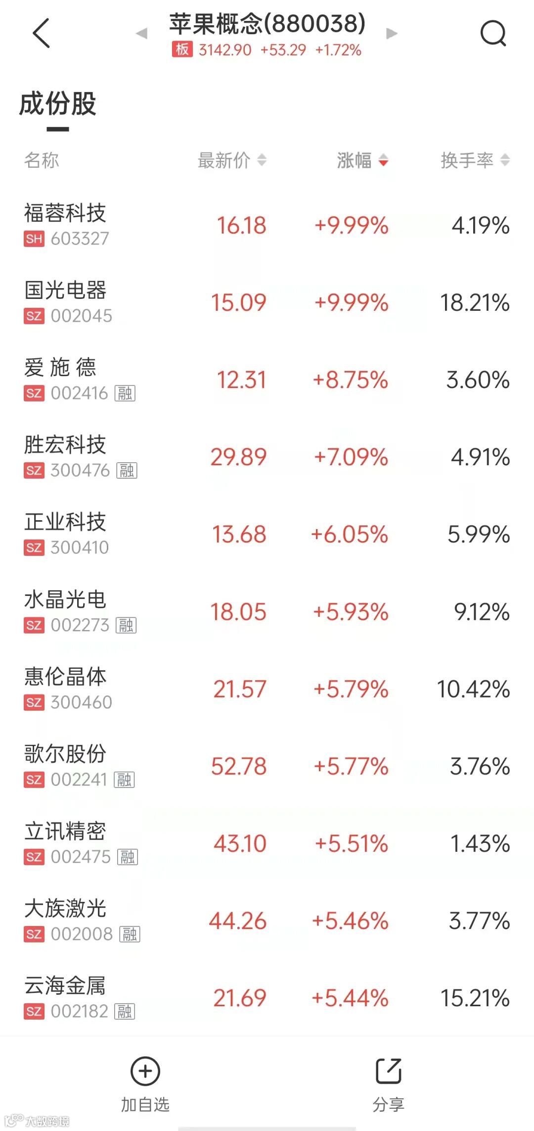 中证金牛座数据显示,截至收盘,共达电声、福蓉科技、国光电器涨停,水晶光电涨5.93%,歌尔股份涨5.77%,立讯精密涨5.51%。