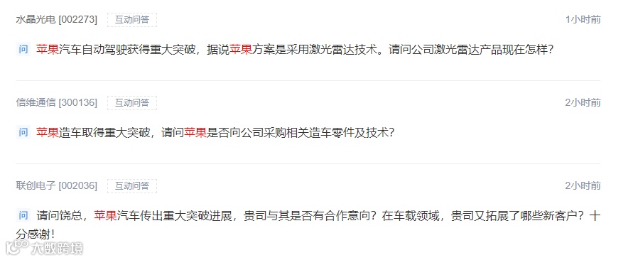 苹果汽车项目的消息也引起投资者的关注。11月19日上午,已有投资者在互动易向水晶光电、信维通信、联创电子咨询。