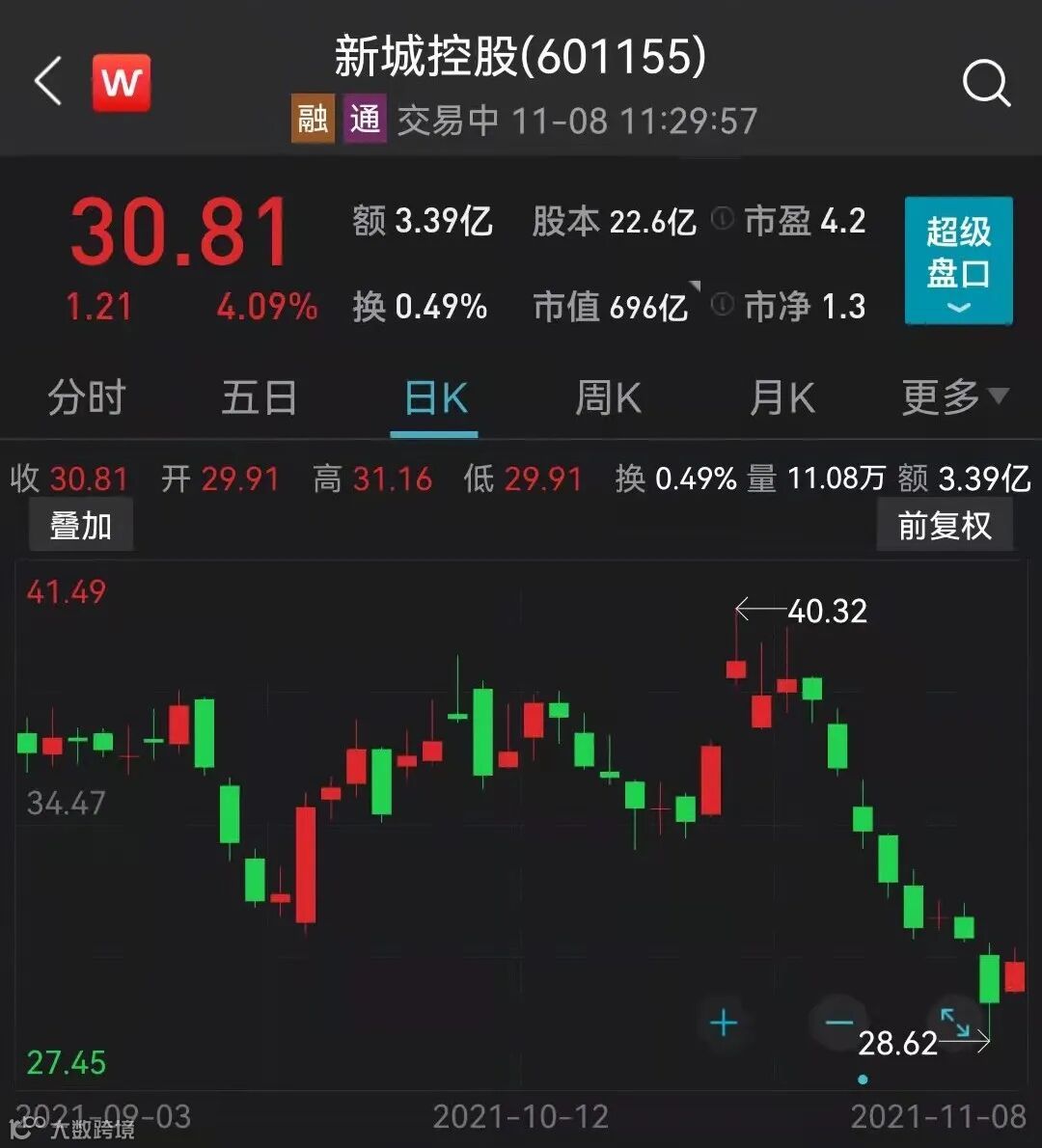 11月8日新城控股开盘大涨,最大涨幅超过5%。截至午间收盘,新城控股收报30.81元/股,上涨4.09%,市值696亿元。