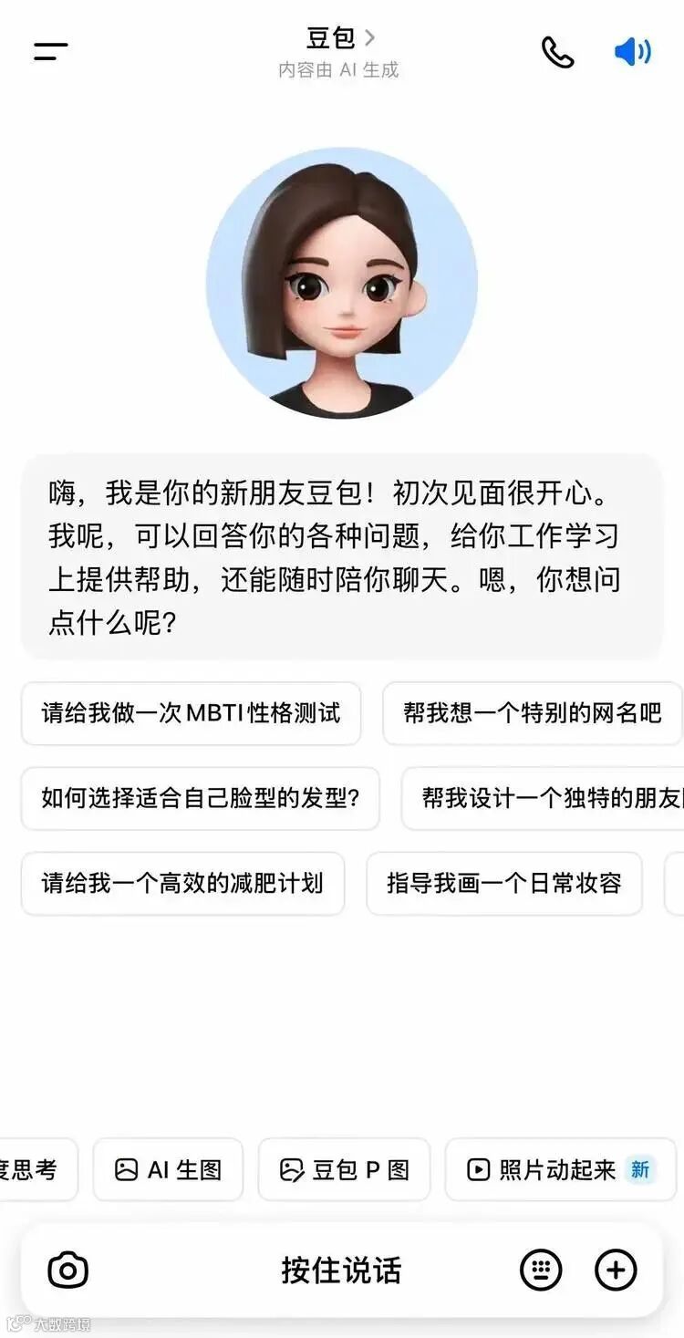 而豆包最初的目标也是提供陪伴服务。但在设计上,除了同样以语音和 “打电话” 的体验为出发点,字节给这个产品添加了一个头像,一个短发女生的头像。从第一天起,她就出现在产品最主要的界面上,用户的第一次交互,感觉就像是在听她介绍自己。这个设计一直延续至今,也体现出该产品背后团队的想法,这是一个从顶层设计就开始实施的 “拟人化” 策略。
