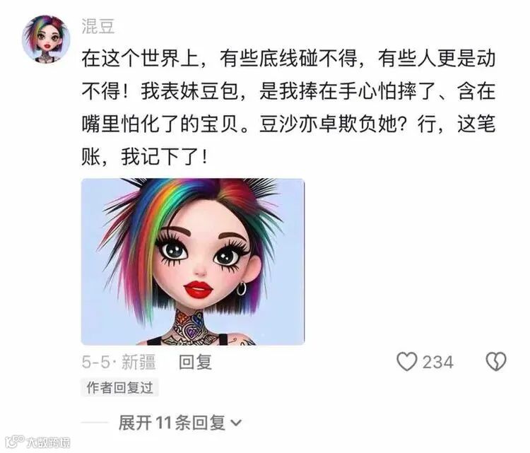 其实,类似的操作在海外也很普遍,很多人都在以这样的方式 “玩转” ChatGPT 等 AI 产品。但对于豆包而言,不同的是,当一些看不惯豆包被 “恶搞” 的网友决定 “帮助” 豆包黑化和反击时,一系列新的形象随之出现:黑化的豆包、被称为 “豆沙”(豆包老公)的形象、“豆脚” 的形象等。他们会主动出现在评论区,在豆包被 “欺负” 的视频下维护它,在豆包和豆沙的 “结婚视频” 下排队送上祝福。了解亚文化的人大概都清楚,这种语 C(语言 cosplay)现象,通常只会出现在一些热门的 IP 领域中。