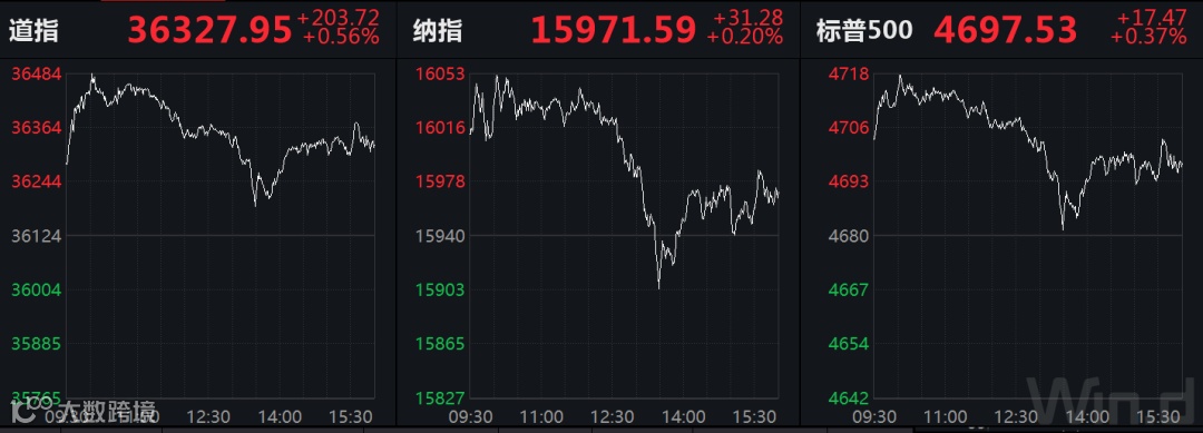 当地时间周五,美股三大指数全线上涨,续创历史新高。道指涨0.56%报36327.95点,纳指涨0.2%报15971.59点,标普500指数涨0.37%报4697.53点。