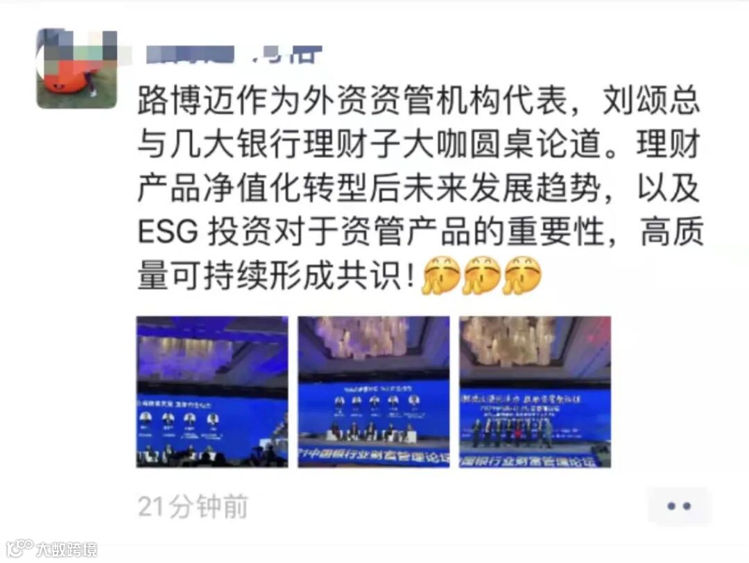 “带货”很专业,为领导台上的观点总结陈词,理财产品净值化转型后发展趋势,还有ESG投资的重要性。这位参会代表工作很到位了哈。