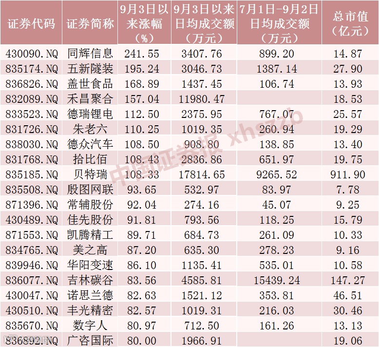 9月3日以来涨幅居前20的精选层股票