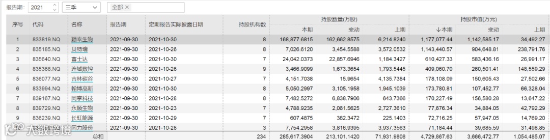 Wind数据显示,截至三季度末,在精选层公司中,机构共计持股16.46亿股,环比增加9.21亿股;三季度末机构持股总市值为266.02亿元,环比增加159.74元。其中三季度末,机构对颖泰生物、贝特瑞持仓市值超百亿。