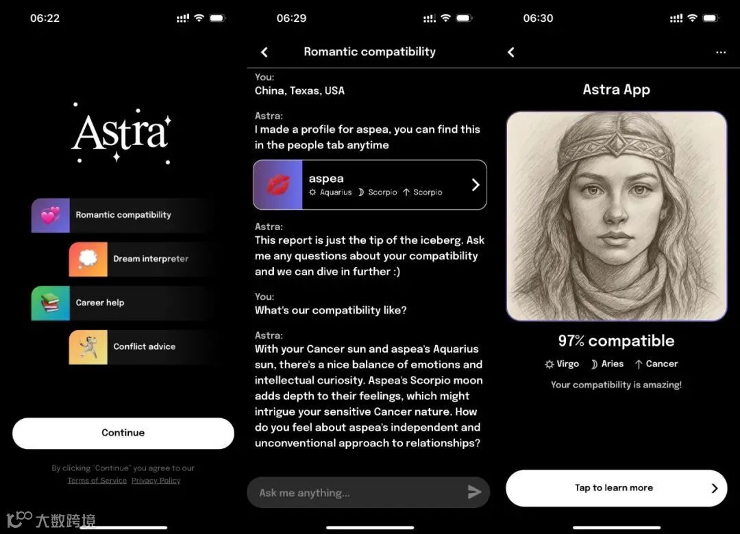 TikTok 上,#StarlaChallenge 话题视频总播放量已超 1.2 亿次。用户热衷分享 AI 生成的 "灵魂伴侣" 画像,评论区满是 "像我前男友"" 这是我未来老公吧 "的调侃。这种行为本质是将情感焦虑转化为可消费的内容商品。当 AI 生成画像成为" 社交货币 ",算法准确性已不重要,关键在于能否引发共鸣与讨论。Starla 的语音交互设计深谙仪式感营造:用户需先完成" 灵魂测试 "(12 道性格题),再进入" 星盘解析 ",最终生成画像。这套流程刻意模仿传统占星师咨询步骤,从建立信任到揭示" 真相 ",每个环节都经精心设计。这种仪式化体验,让用户在虚拟世界获得现实中稀缺的确定性。Astra 的" 伴侣星盘测试 "允许用户上传心仪对象生日,算法会生成两人" 缘分指数 ",恰好满足年轻人对" 快速匹配 "的需求。更微妙的是,其聊天机器人会在用户生日当天发送定制祝福,这种" 数字陪伴 " 的细腻度甚至超过许多现实人际关系。