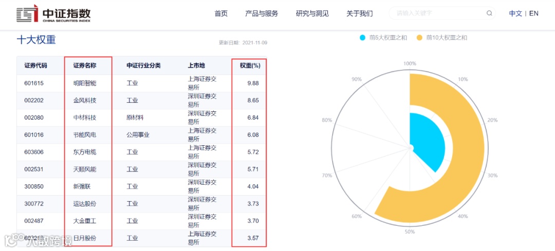 截至11月9日,中证风电产业指数的前十大权重股分别为明阳智能、金风科技、中材科技、节能风电、东方电缆、天顺风能、新强联、运达股份、大金重工、日月股份。不难发现,重仓股多属于风电领域的头部公司。比如,天顺风能是全球风电塔架行业龙头;明阳智能2020年风机在国内市场占有率排名第三,全球第六;金风科技2020年风机国内市场占有率第一,全球第二;中材科技2020年风电叶片国内市场占有率第一。