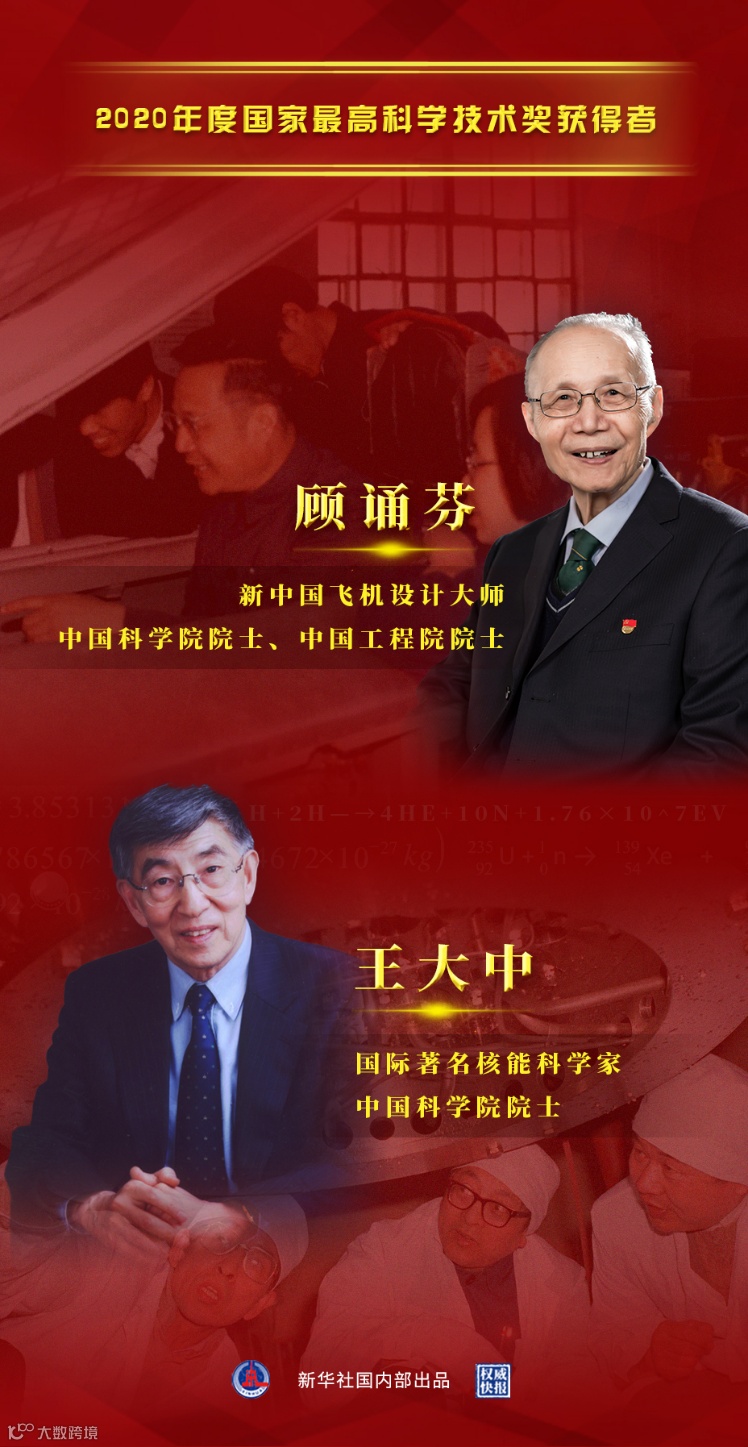 据科技部消息,11月3日,2020年度国家科学技术奖励大会在北京人民大会堂召开。2020年度国家科学技术奖共评选出264个项目、10名科技专家和1个国际组织。其中,91岁的新中国飞机设计大师顾诵芬院士和86岁的国际著名核能科学家王大中院士,分获国家最高科学技术奖。