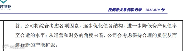 前述调研对债务问题同样有提及。天齐锂业称,将综合考虑各项因素,逐步优化债务结构,进一步降低资产负债率至合适的水平。且从运营和财务角度来看,公司会考虑保持合理的负债从而进行新的产能扩张。