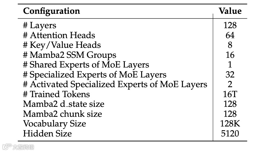 具体来看,模型总参数达560B,其中激活参数56B,层级构成中FFN层占50%,Mamba2层占44.5%,Attention层仅占5.5%。这种设计在保证模型表达能力的同时,显著降低了计算复杂度。以Mamba2层为例,其状态空间模型结构避免了传统Transformer的二次时间复杂度,使得处理256K超长上下文成为可能,同时在训练阶段实现了显存与计算效率的双重优化。