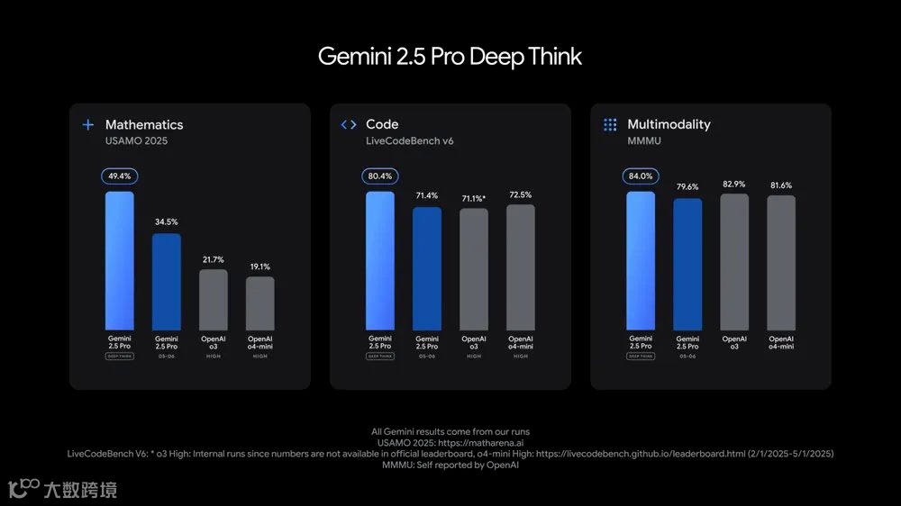 Gemini无疑是本次大会最耀眼的主角。作为谷歌DeepMind历时三年打磨的集大成之作,Gemini 2.5系列在性能、功能和应用场景上实现了全方位突破。Gemini 2.5 Pro在LMArena和WebDev Arena两大权威榜单中包揽所有类别第一,ELO得分高达1448分,远超OpenAI的o3模型。其数学推理能力在2025 USAMO奥赛中达到40.4%的正确率,比前代提升10%;多模态推理MMMU基准测试得分84.0%,在图像、视频、文本的联合理解上展现出惊人潜力。这种突破得益于Deep Think增强型推理模式——通过模拟人类「假设-验证」的思维过程,模型在处理复杂数学证明、代码逻辑优化等任务时,能够生成多路径解决方案并自主选择最优路径。