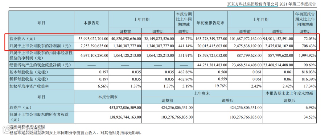 10月28日晚,“面板一哥”京东方A发布2021年三季报。