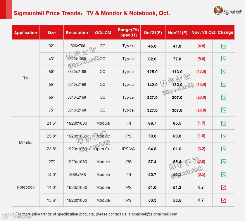 不过,群智咨询分析,2021年三季度,全球LCD TV面板市场的供需环境发生明显变化,面板价格进入下跌通道;2021年四季度,全球LCD TV面板市场供需环境呈现整体宽松,预计中小尺寸价格降幅明显收窄,中大尺寸LCD TV面板价格依然维持较大降幅。