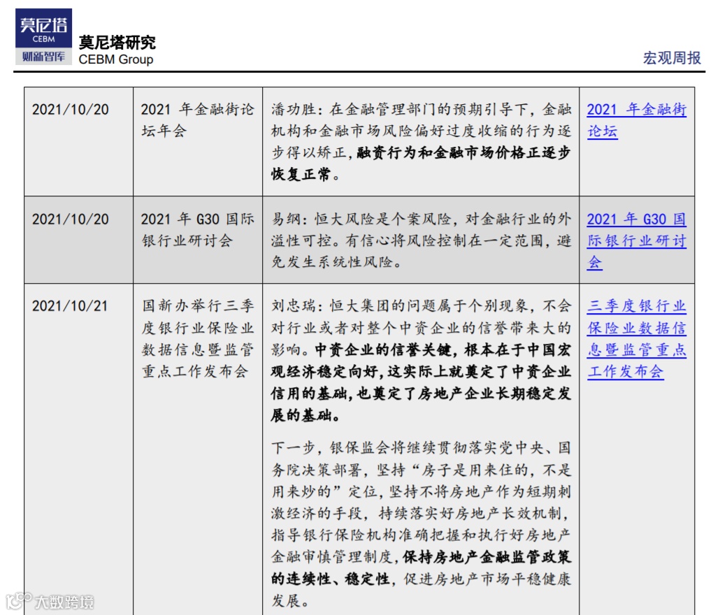 近期,央行、银保监会多次发声表示将“维护房地产市场的健康发展,维护住房消费者的合法权益”。人民银行、银保监会已于9月底召开房地产金融工作座谈会,指导主要银行准确把握和执行好房地产金融审慎管理制度,保持房地产信贷平稳有序投放,维护房地产市场平稳健康发展。