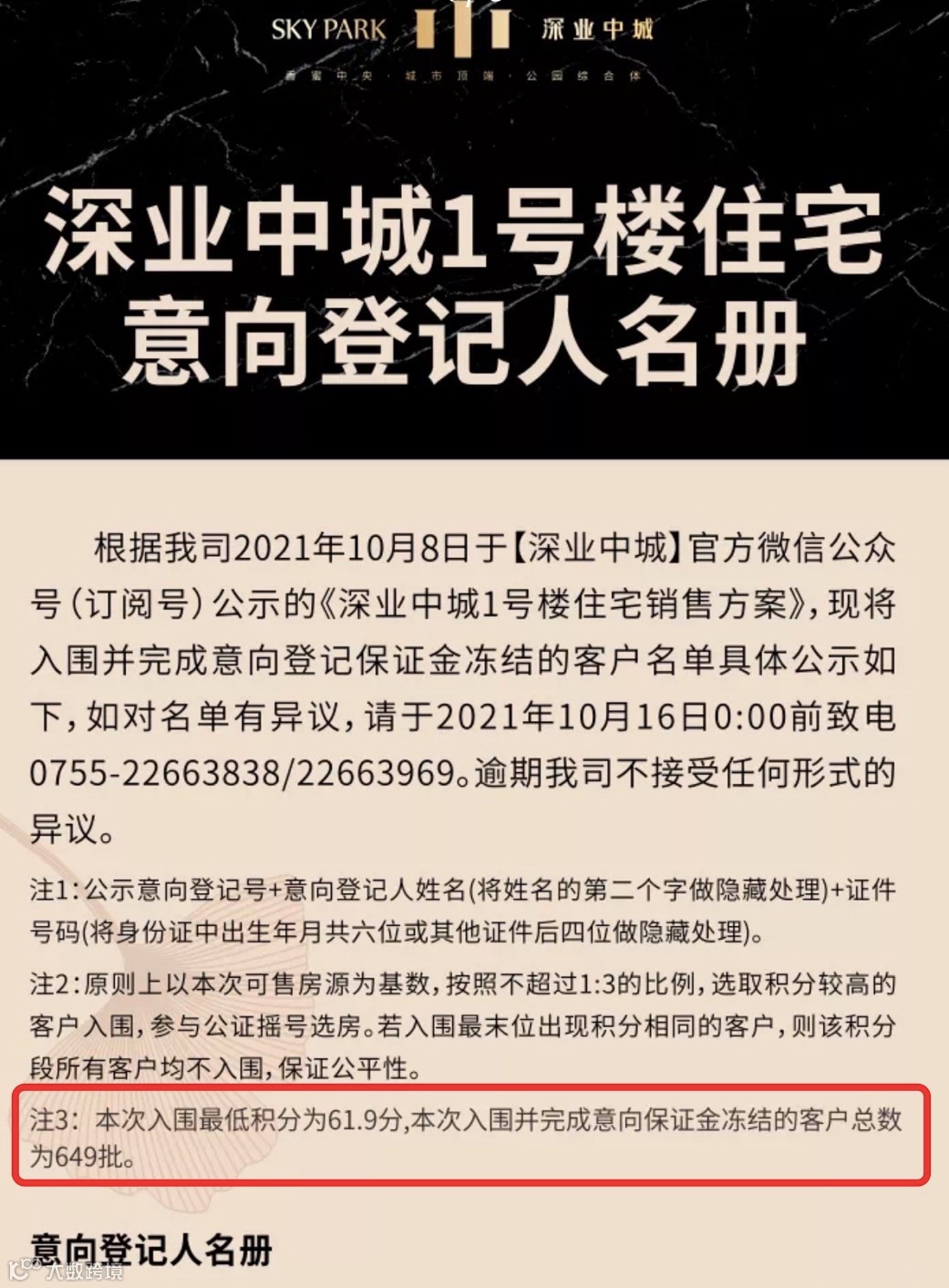 自取得预售证以来,该盘热度高居不下。此前,深业中城公布的意向登记人名册显示,以可售房源为基数,按照1:3的比例共有649批客户入围摇号选房,中签率为34%,最低入围积分为61.9分。