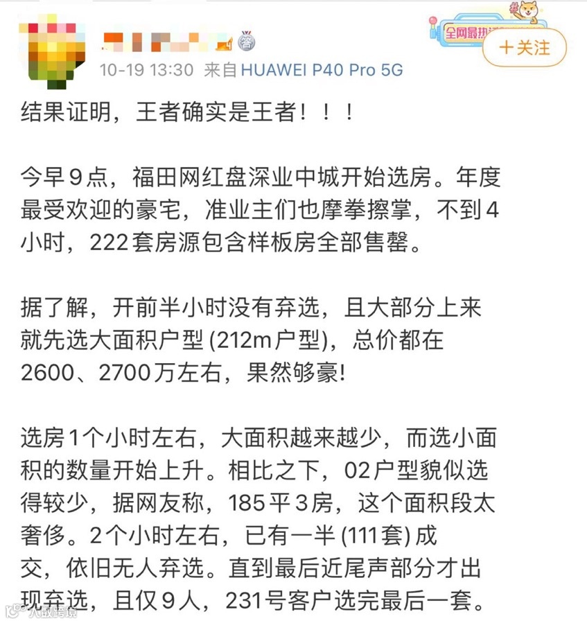 10月19日早上9点,深业中城正式摇号选房。中午不到1点,销控就显示全部房源售罄,吸金52.5亿元。