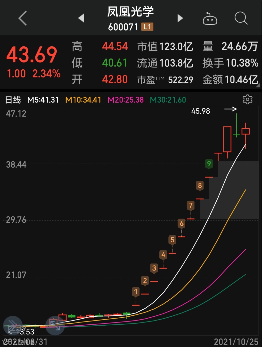 自公告发布后,公司股价一路飙升,9月30日-10月21日期间,连续收获了11个涨停板。10月22日股价冲高后回落,截至收盘股价下跌2.8%。10月25日收盘,股价翻红,涨幅为2.34%。