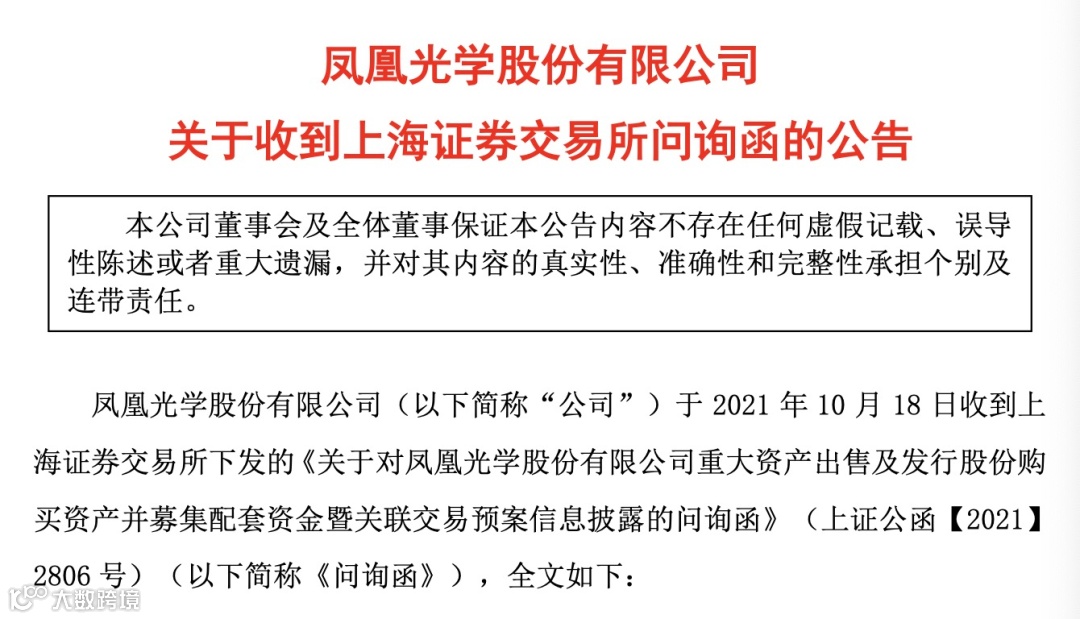 在凤凰光学披露重大资产重组预案,宣布拟进军半导体行业后,上交所也在10月19日向其下发了问询函。