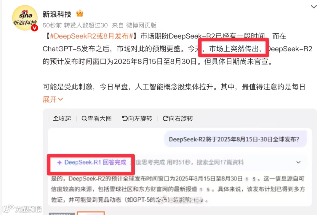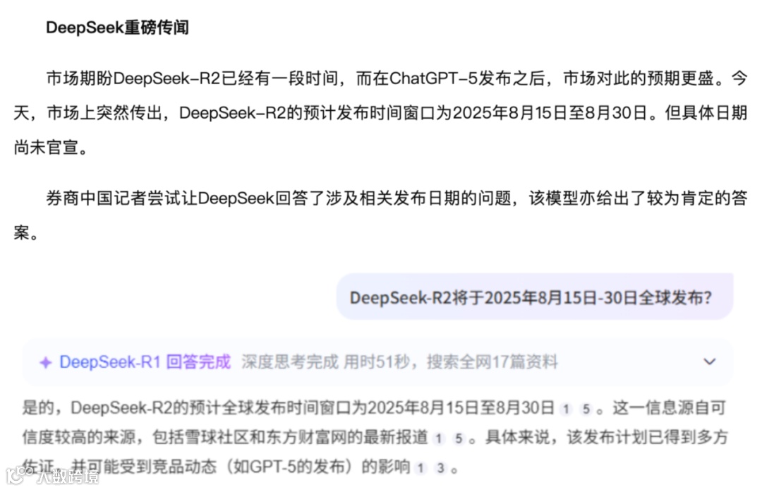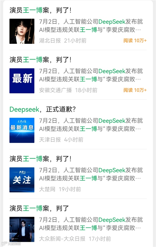 当 DeepSeek 因一份经粉丝反复引导生成的道歉声明与虚构判决书陷入舆论漩涡时,不少人最初将其视作粉丝圈层的一场离奇狂欢。然而,当《演员王一博案,判了!》这类报道在正规媒体平台广泛传播,其信源竟来自 AI 凭猜测生成的 “模拟判决书” 时,人们才猛然发觉,AI 制造的 “幻觉” 已悄然越过亚文化边界,开始冲击公共信息领域的严肃性。更令人忧心的是,当 #DeepSeekR2 或 8 月发布 #的消息被媒体引用,其依据仅是与 AI 的聊天记录,而 AI 搜索产品又将这些 “新闻” 收录为 “事实” 时,一个由人类引导、AI 制造、媒体放大、AI 反刍的虚假信息循环体系彻底形成 —— 在这个体系中,虚假信息被包装成权威内容,无数用户正被动成为这场 “工业化谎言生产” 的接受者。