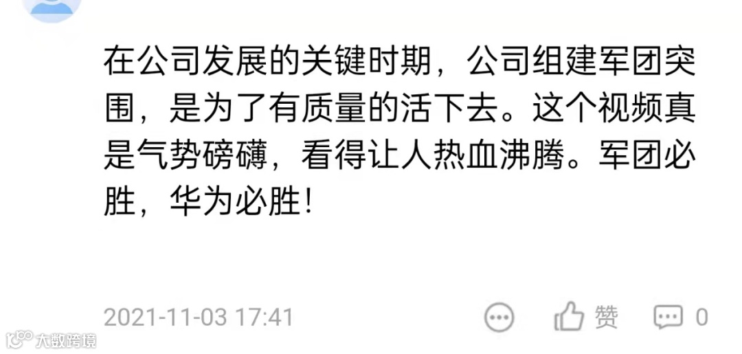 在华为心声社区,不少华为员工留言。有员工表示:“在公司发展的关键时期,公司组建‘军团’突围,是为了有质量地活下去。这个视频真是气势磅礴,看得让人热血沸腾。‘军团’必胜,华为必胜!”
