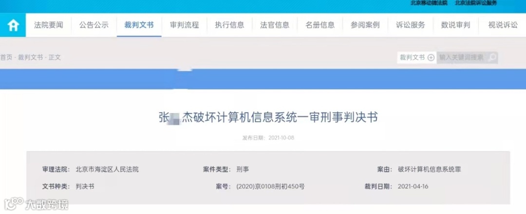 10月初,北京市海淀区人民法院公开一起破坏计算机信息系统罪案件,被告人张某杰被判处有期徒刑五年六个月。