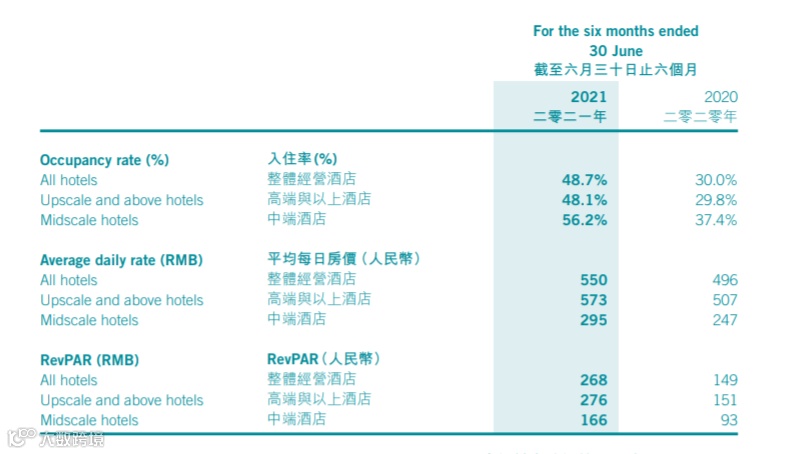 截至2021年6月30日,万达酒店发展租赁与经营酒店占营运酒店数的4%、管理酒店占94%、特许经营酒店占2%。2021年上半年,万达酒店发展整体经营酒店、高端及以上酒店、中端酒店平均每日房价分别为550元 、573元和295元,入住率分别为48.7% 、48.1% 和56.2%。2020年,整体经营酒店、高端及以上酒店、中端酒店每日房价分别为496元、507元和247元;入住率分别为30%、29.8%及37.4%。