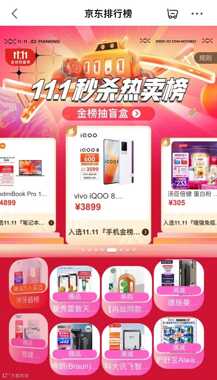 10月31日晚,京东数据显示,Apple品牌4小时成交额同比增长200%;小米、OPPO、vivo 开场1小时成交额超去年11月1日全天;高端笔记本电脑成交额同比增长340%,其中ROG系列、ThinkPad X1系列成交额同比增长均超400%;4k投影机成交额同比增长240%。开场10分钟内,京东手机“放心换”9.9服务包服务用户人数较京东618增长10倍,使用“爱回收”以旧换新订单量较京东618增长20倍,手机小时购成交额同比增长15倍。