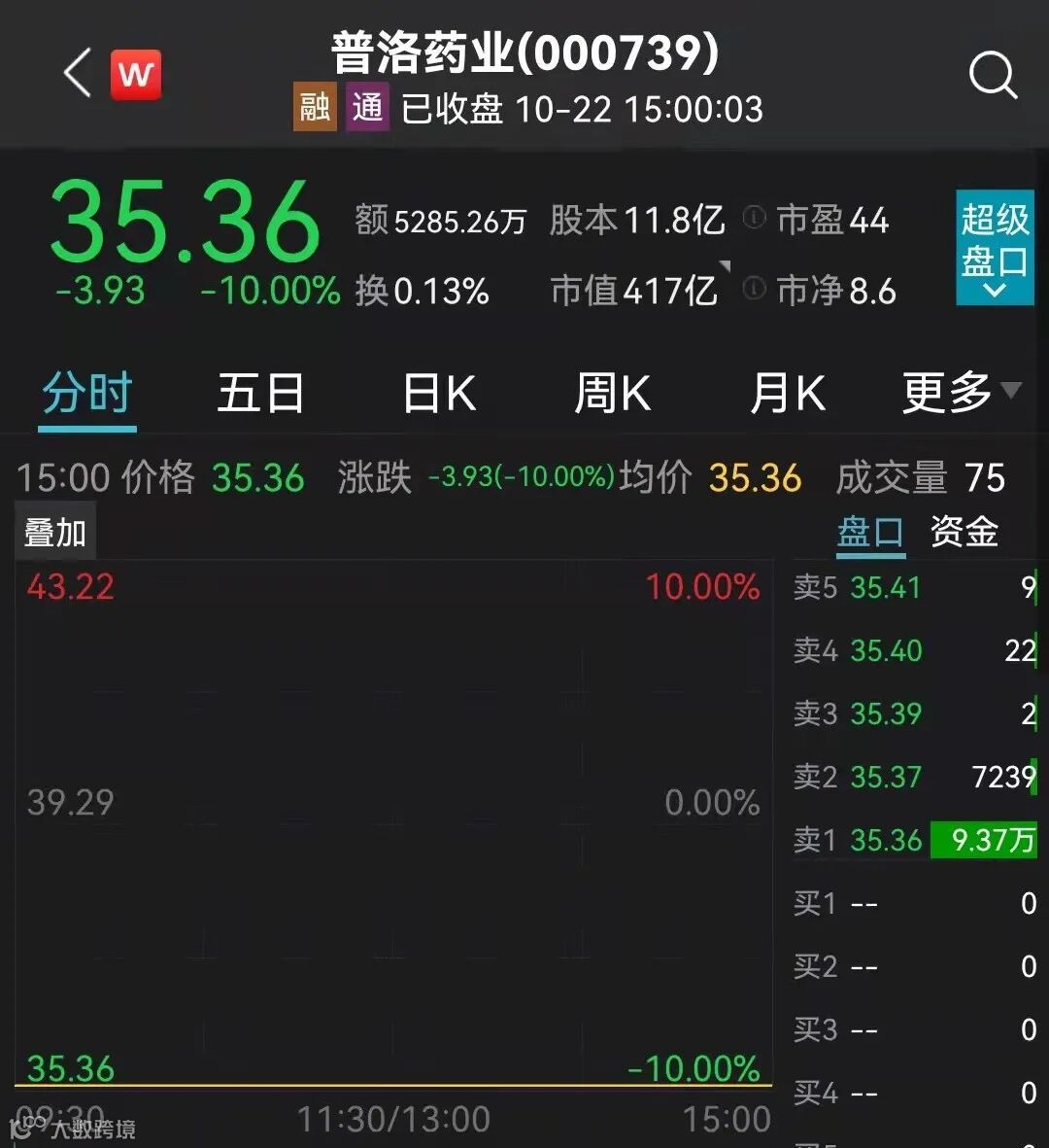 10月22日,普洛药业股价一字跌停,报收35.36元/股,总市值417亿元。截至收盘,跌停板上封单超9万手。