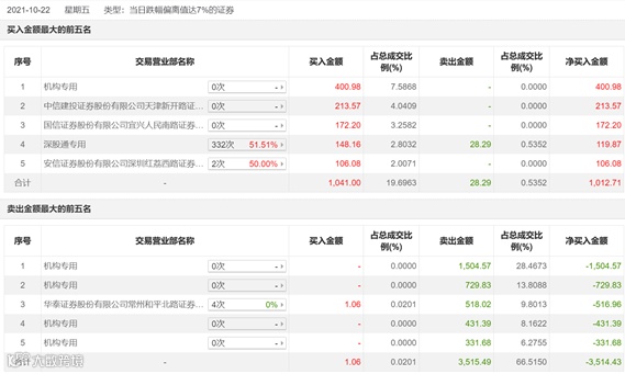 10月23日盘后龙虎榜数据显示,普洛药业前五大卖出席位中,机构专用席位就占了4个,累计净卖出近3000万元。相对来说,买入前五大席位中,买一也是机构专用席位,但净买入仅为400.98万元,可谓微乎其微。全天前五大买入和前五大卖出席位合计净卖出2501.72万元。