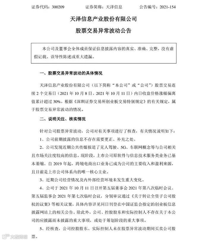 针对最新股票异常波动,天泽信息10月12日发布公告称,公司发现近期媒体报道了无人驾驶、5G、车联网概念等与公司相关且市场关注度较高的信息。现阶段,上市公司原软件与信息技术服务类业务已基本萎缩。自2019年起,跨境电商出口业务已成为公司的主要收入和盈利来源,且目前是上市公司体系内的唯一核心主业。
