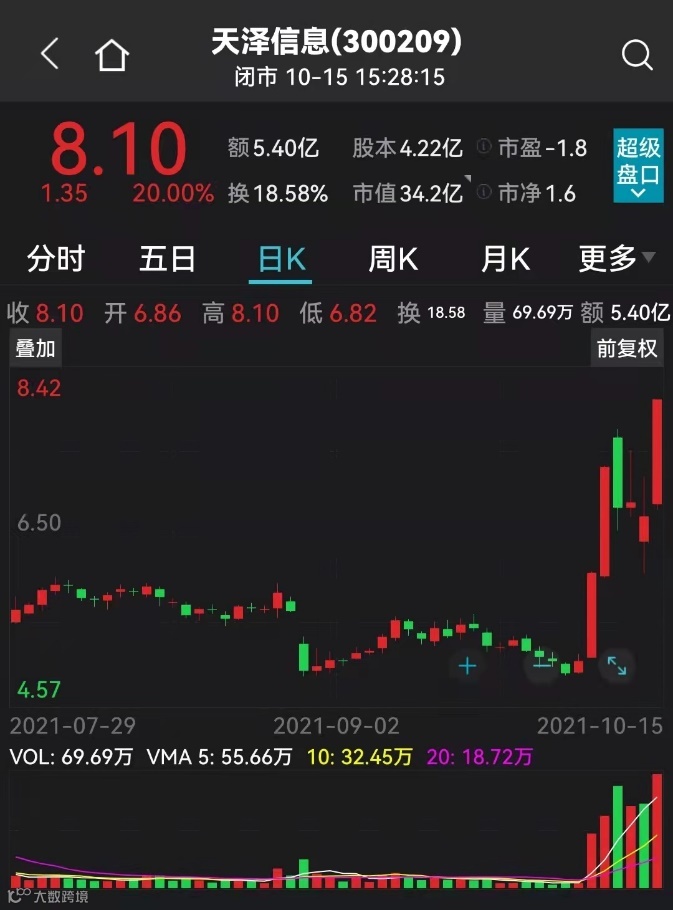 10月15日,天泽信息开盘后大幅走高,随后迅速强势涨停。截至收盘,天泽信息报每股8.1元,上涨20%。