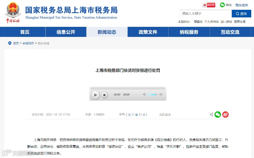上海市税务局网站10月18日公布,上海市税务局第一稽查局前期在郑爽偷逃税案件检查过程中发现,张恒作为郑爽参演《倩女幽魂》的经纪人,负责相关演艺合同签订、片酬商谈、合同拆分、催款收款等事宜,并具体策划起草“增资协议”,设立“掩护公司”,掩盖“天价片酬”,规避行业主管部门监管,帮助郑爽逃避履行纳税义务。