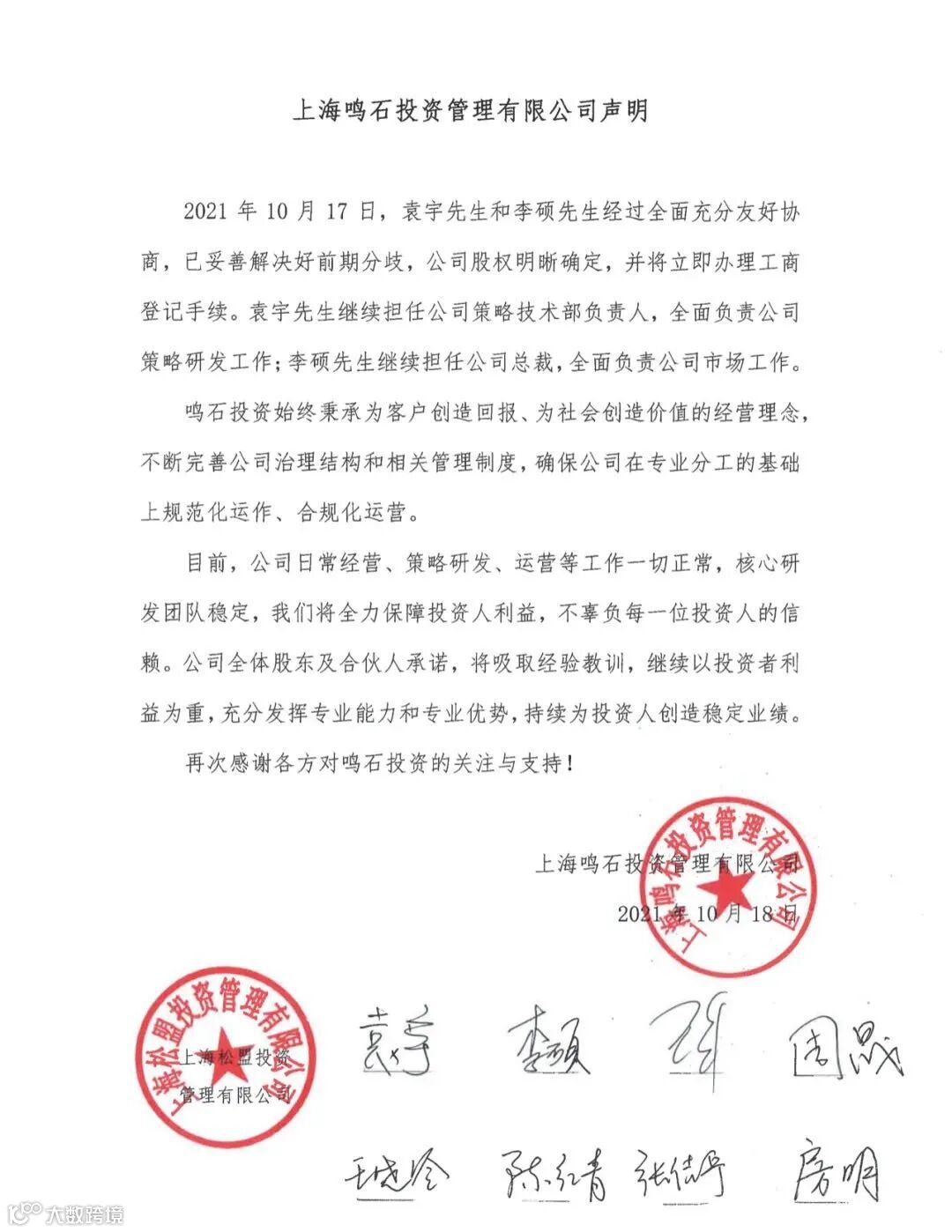 10月18日凌晨,上海鸣石投资再次发布声明称,袁宇和李硕经过全面充分友好协商,已妥善解决好前期分歧,公司股权明晰确定,并将立即办理工商登记手续。袁宇将继续担任公司策略技术部负责人,全面负责公司策略研发工作;李硕继续担任公司总裁,全面负责公司市场工作。