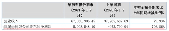 报告期内,左成新材实现营业收入6705.09万元,同比增长79.93%;归母净利润为590.35万元,去年同期亏损97.28万元。其中,公司第三季度营收为2644.42万元,同比增长63.44%;实现归母净利润396.37万元,去年同期亏损116.74万元。