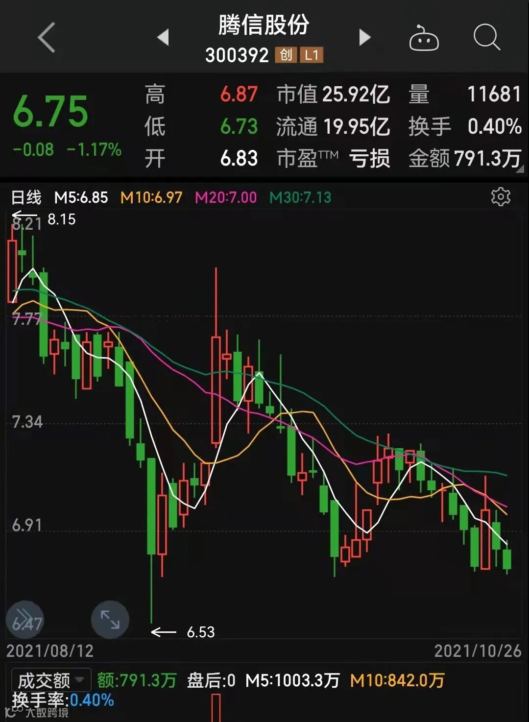 股东情况方面,截至2021年9月30日,腾信股份共有股东17748户。腾信股份股价10月26日报收6.75元/股,总市值不到26亿元。